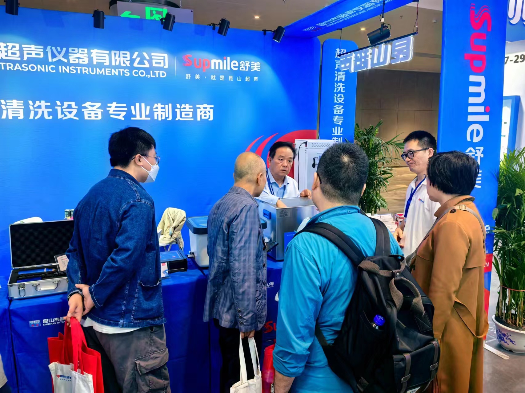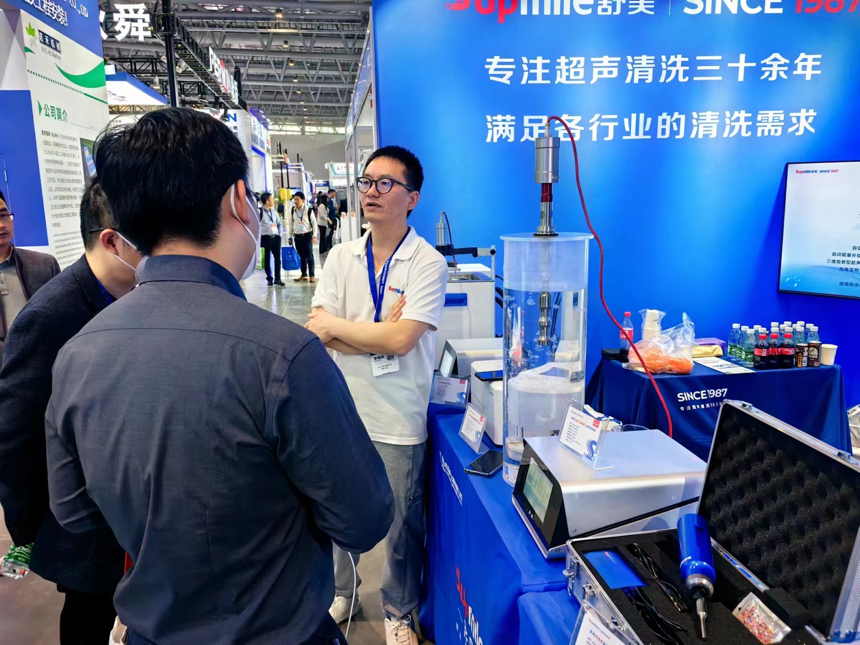 本屆博覽會中,本公司(昆山超聲)展臺有不少專業觀眾駐足交流學習,聊了很多關于專業清洗的話題,由本公司技術工程師周吉先生、副總經理劉立人先生一一簡答,并當天為客戶制定了許多不同的超聲清洗方案;公司也收益良多,發現了許多新的行業領域!